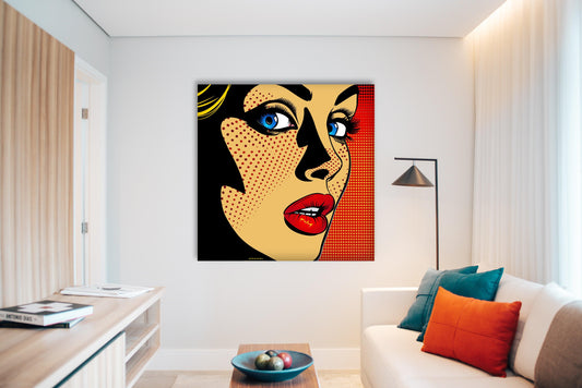Pop-Art - Frauengesicht mit rotem Hintergrund, inspiriert von Roy Lichtenstein | Glanzeffekt