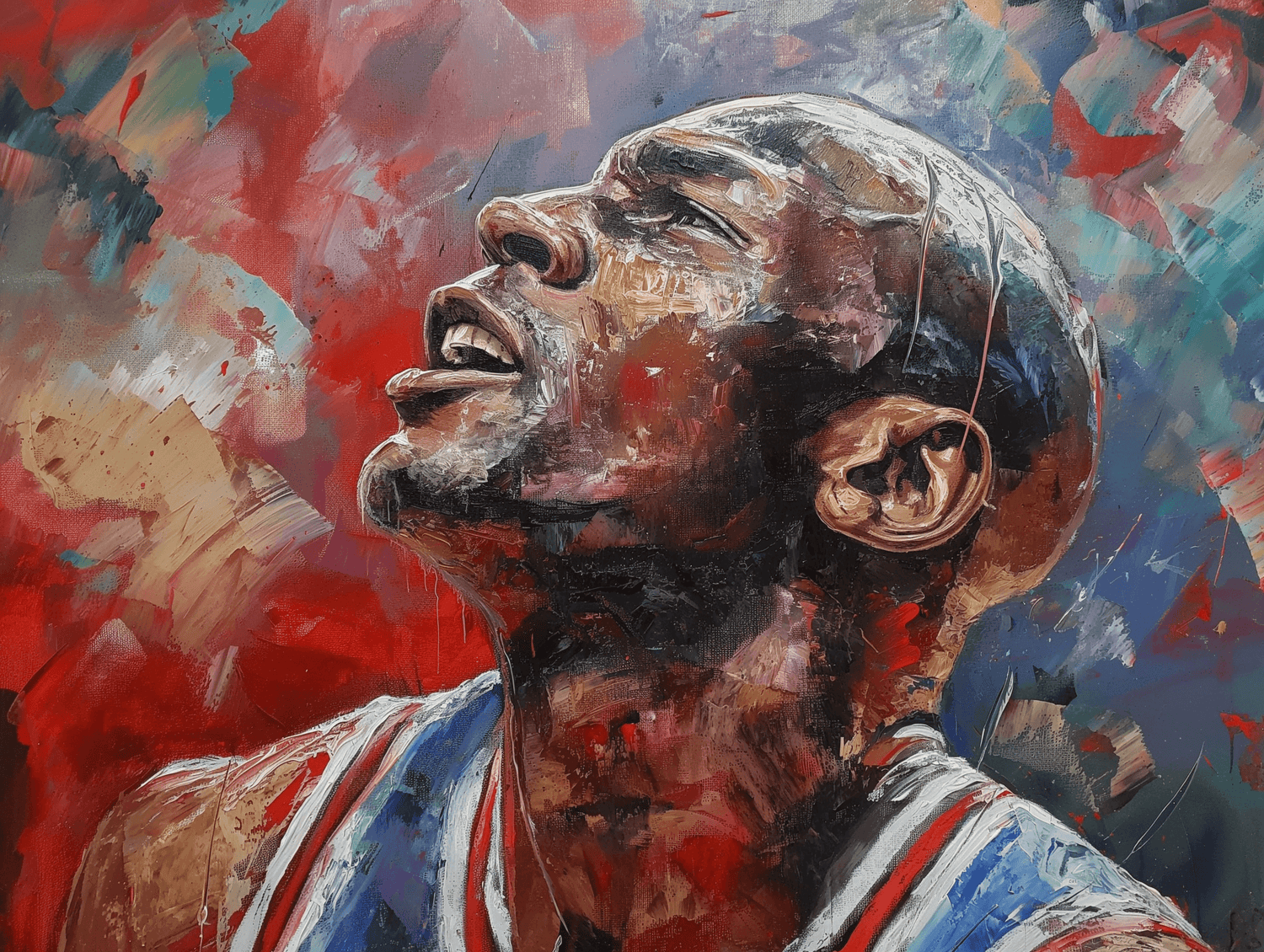 Materialgemälde mit zentralen Figuren aus der Welt der Musik und des Sports,...
