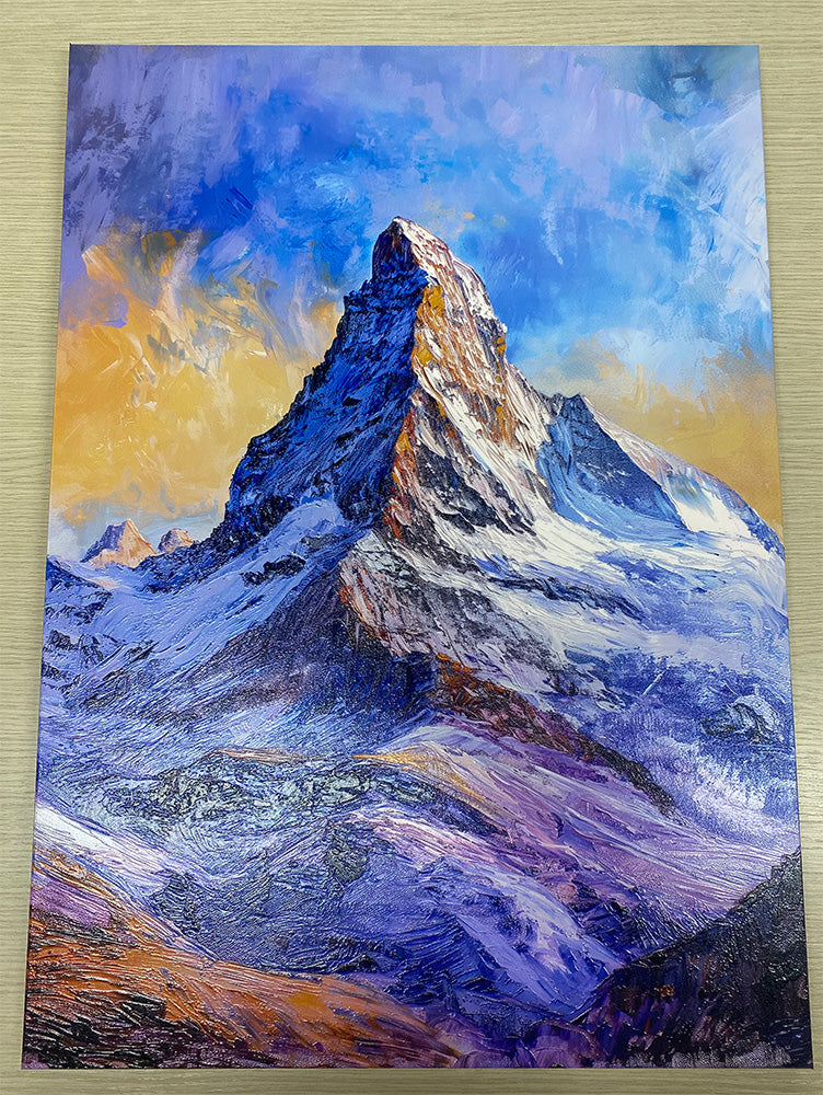 Unser Materialgemälde zeigt den im Impressionismus-Stil gehaltenen Monte Cervino im Morgengrauen in Relief und Es wird mit der HD-Flachdrucktechnik oder mit 2,5D-UV-LED-Technologie hergestellt, um die Materialität des Motivs nachzubilden und einen einzigartigen 2,5D-Effekt zu erzielen. Der UV-LED-Druck ermöglicht uns lebendige und langlebige Farben auf einem hochwertigen, starren Träger. Für jedes Gemälde sind zwei Haken enthalten, damit Sie es aufhängen können.