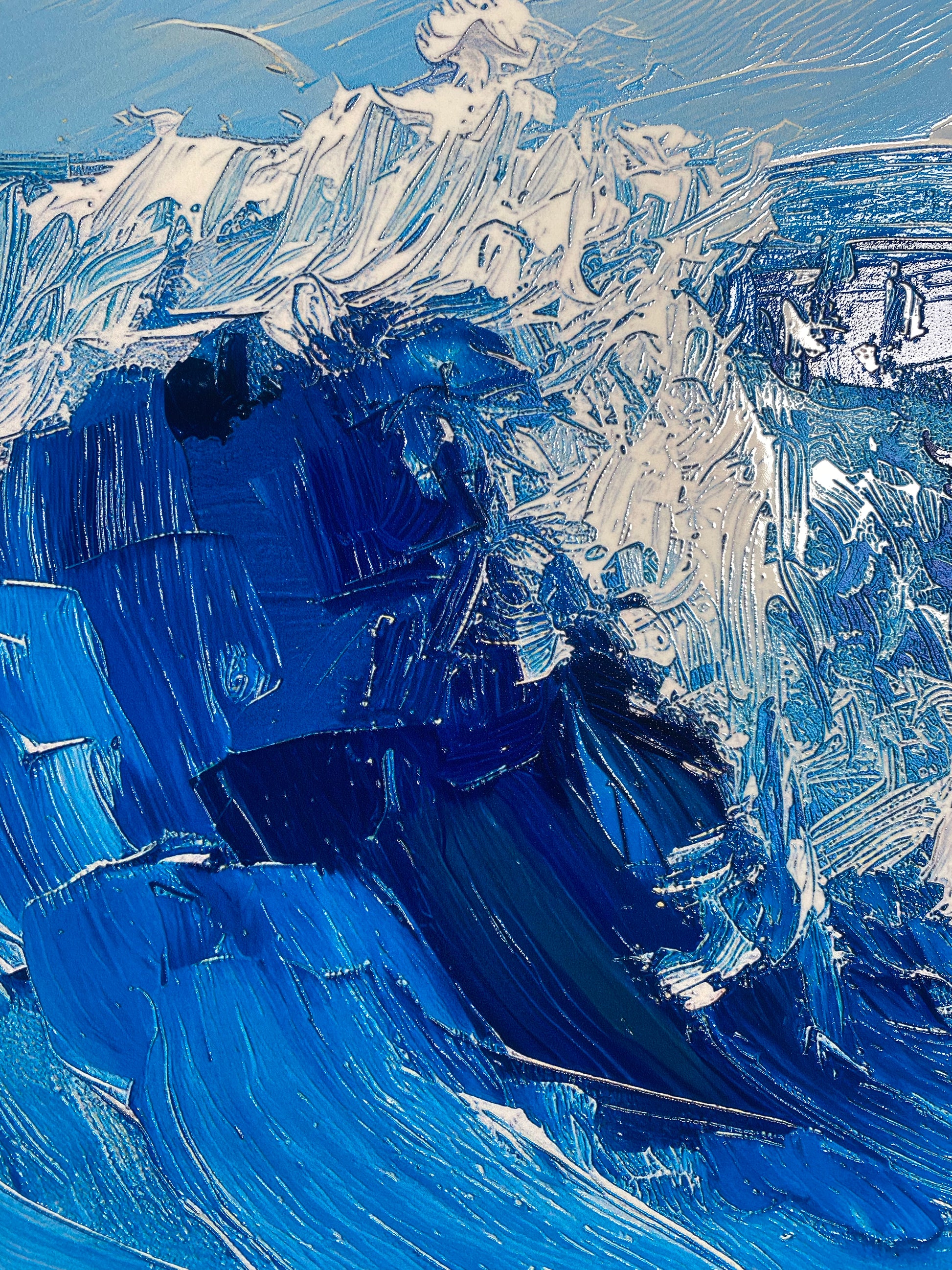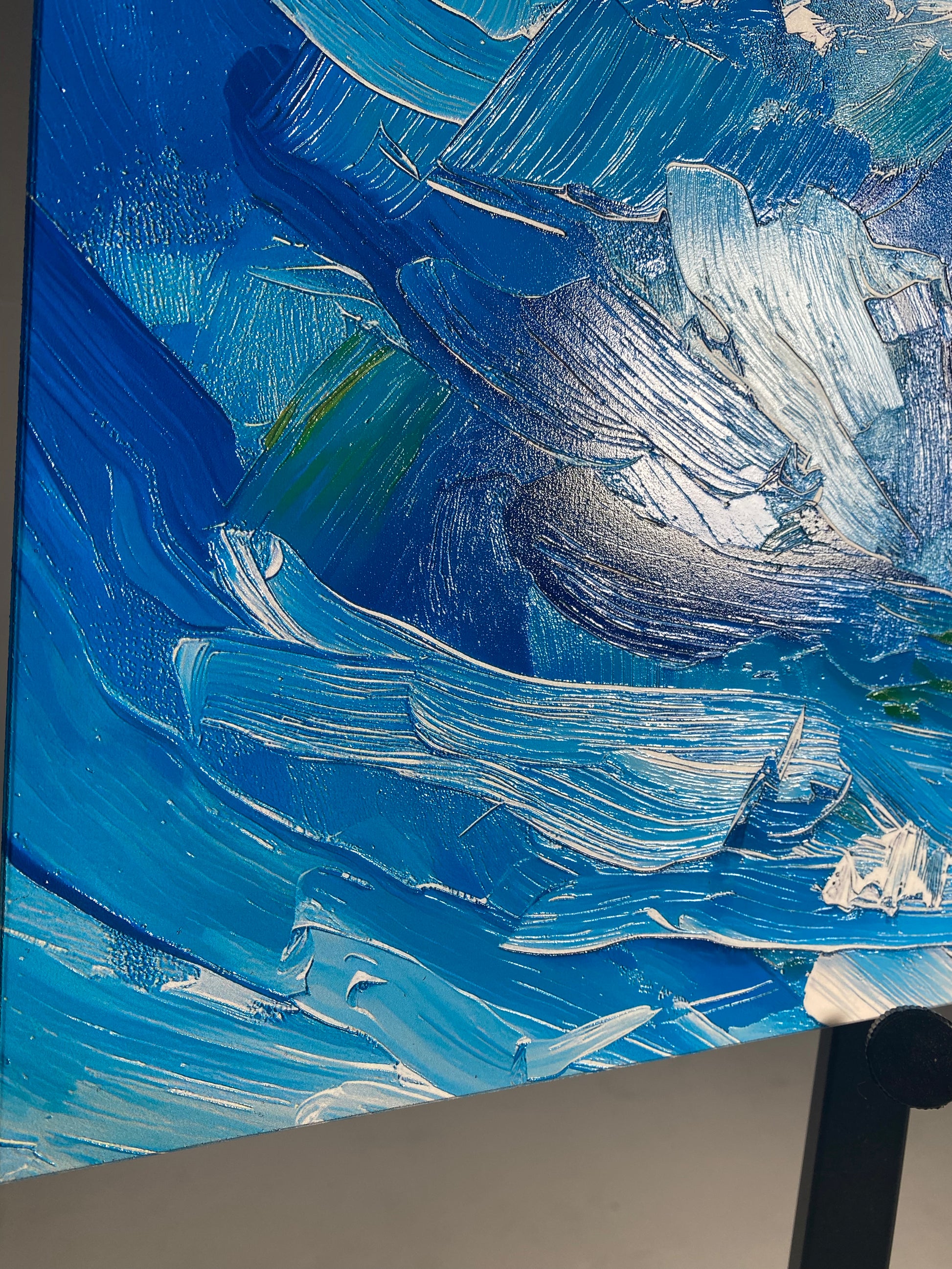 Unsere Materialmalerei zeigt die Wellen des Meeres im Relief und Es wird mit der HD-Flachdrucktechnik oder mit 2,5D-UV-LED-Technologie hergestellt, um die Materialität des Motivs nachzubilden und einen einzigartigen 2,5D-Effekt zu erzielen. Der UV-LED-Druck ermöglicht uns lebendige und langlebige Farben auf einem hochwertigen, starren Träger. Für jedes Gemälde sind zwei Haken enthalten, damit Sie es aufhängen können.