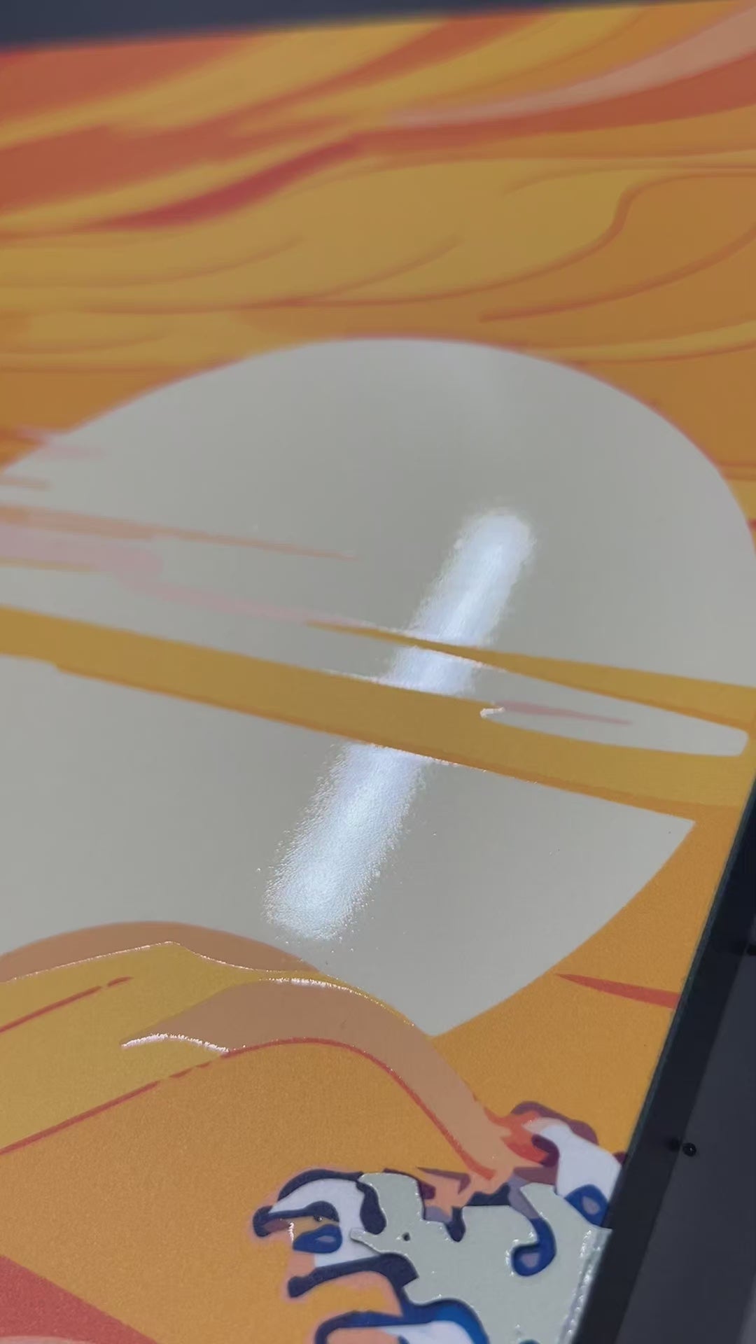 - Hochglanzgemälde werden mit UV-Farbschichten hergestellt, die einige Teile des Gemäldes glänzend und reflektierend machen