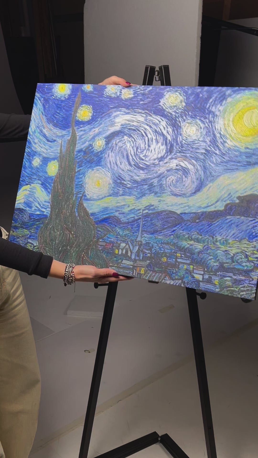 Unser Materialgemälde, inspiriert von Van Goghs Meisterwerk „Sternennacht“, Es wird mit der HD-Flachdrucktechnik oder mit der 2,5D-UV-LED-Technologie hergestellt, um die Materialität des Motivs nachzubilden und einen einzigartigen 3D-Effekt zu erzielen. Der UV-LED-Druck ermöglicht uns lebendige und langlebige Farben auf einem hochwertigen, starren Träger. Es fühlt sich an wie ein echtes Ölgemälde. Für jedes Gemälde sind zwei Haken enthalten, damit Sie es aufhängen können.