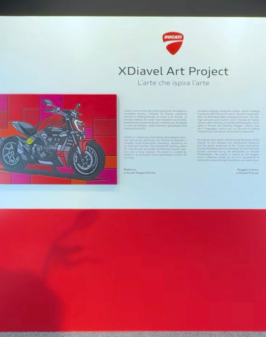 Materico è stata selezionata insieme a Ducati Reggio Emilia per XDiavel Art Project, la nostra opera è ora in mostra al museo Ducati. Dal loro sito: "Realtà innovativa che, attraverso l’uso della stampa materica 3D, rende le opere d’arte tangibili e accessibili. Grazie a questa tecnica, che unisce precisione tecnologica e sensibilità artistica, l’arte si trasforma in un’esperienza concreta, tridimensionale, da vivere con lo sguardo e con il tatto. L’opera nata da questa collaborazione interpreta perfettamente l’essenza Ducati: trasformare la passione in materia viva, dando forma a un oggetto che unisce emozione e tecnologia in un equilibrio unico."