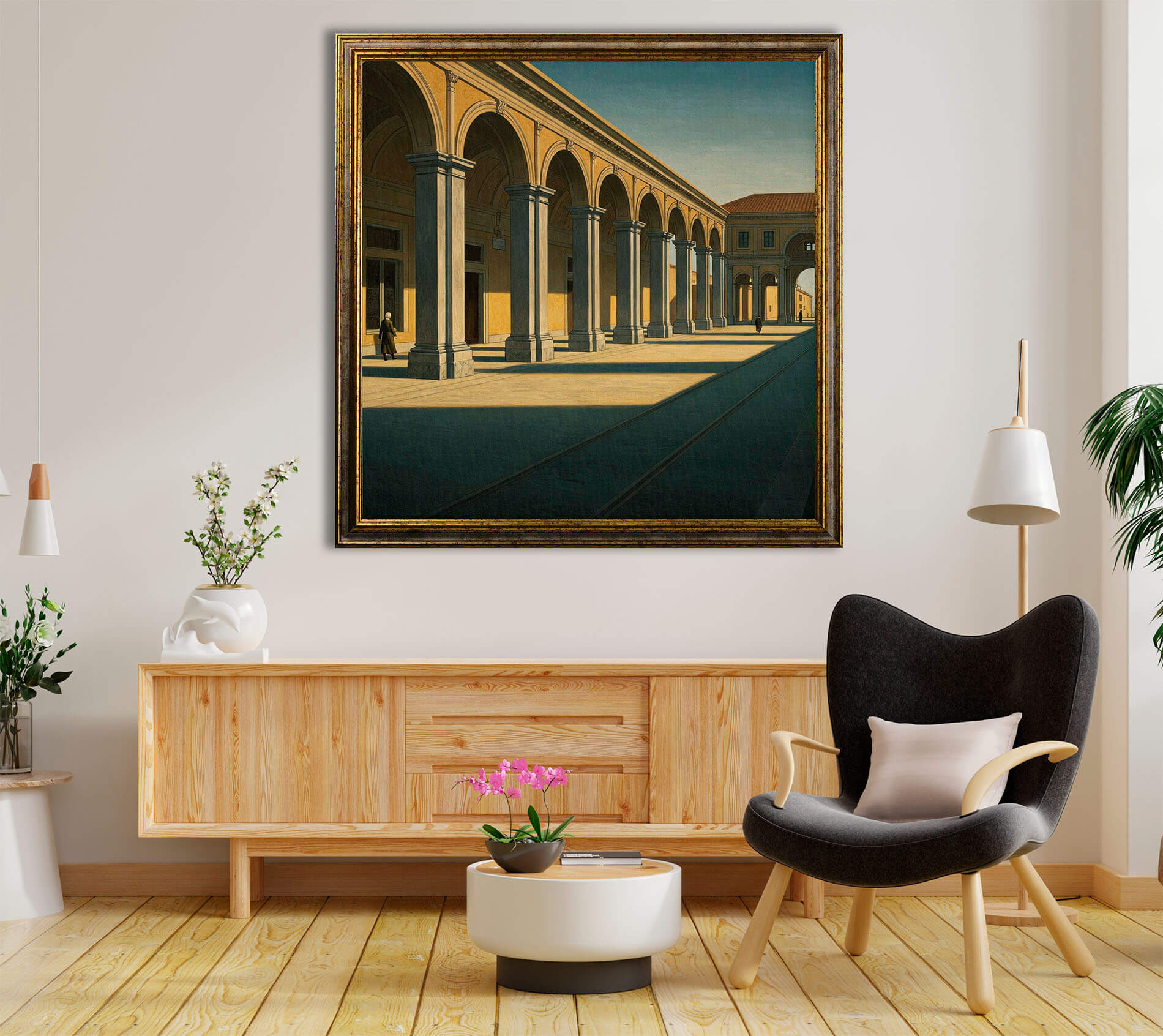 Ogni opera Materico è stampata su un pannello rigido spesso 2 cm, con eleganti bordi neri, pensato per offrire un risultato estetico solido e raffinato. A differenza delle comuni tele sottili e poco tese, il nostro supporto garantisce stabilità, presenza e durata nel tempo. Ogni quadro arriva pronto da appendere grazie ai pratici ganci in metallo inclusi nella confezione, per un’installazione semplice e immediata. È inoltre possibile arricchire l’opera con una cornice a scelta: una classica cornice "barocca" dal gusto intramontabile oppure una più essenziale cornice americana per uno stile contemporaneo.
