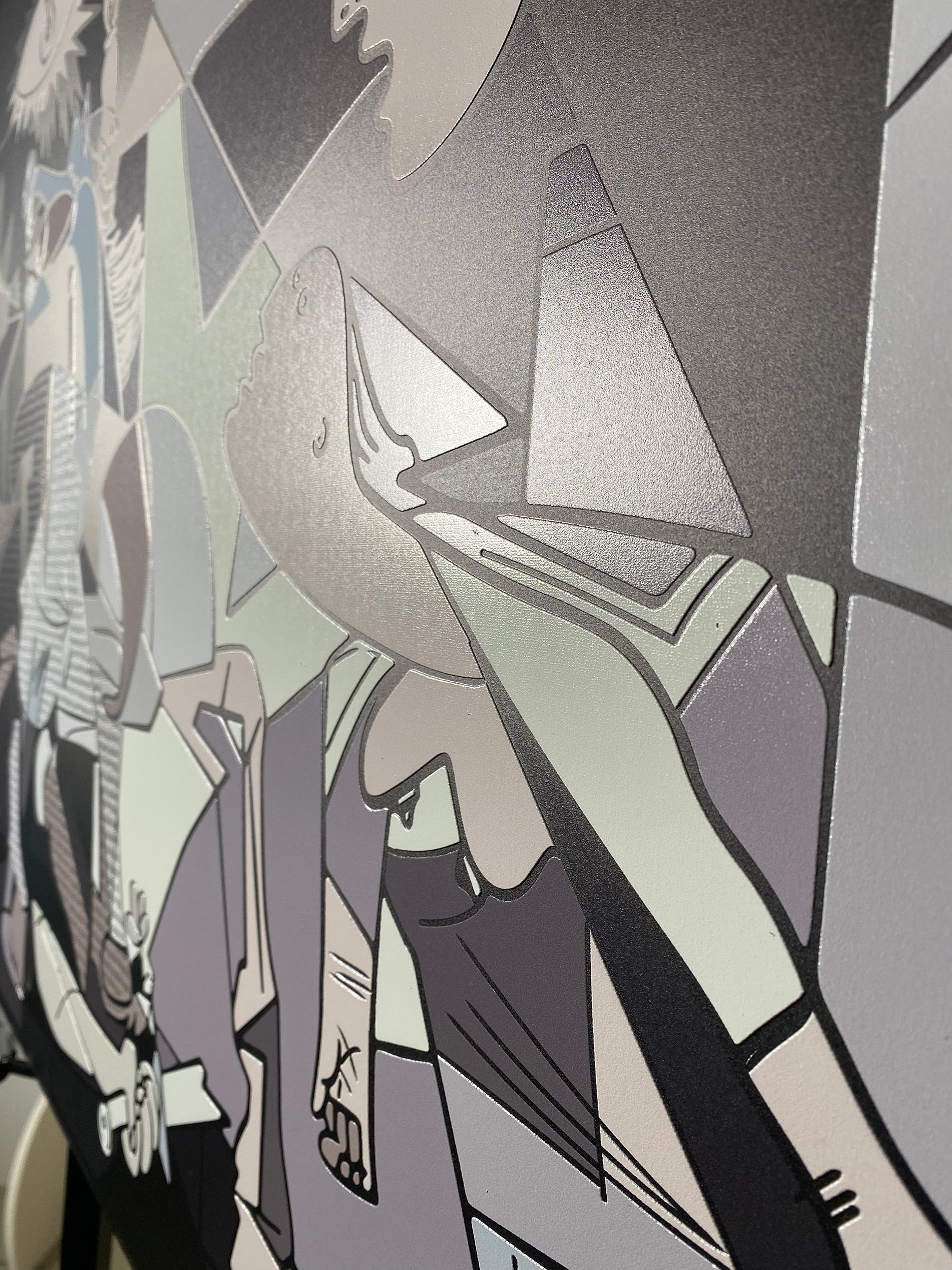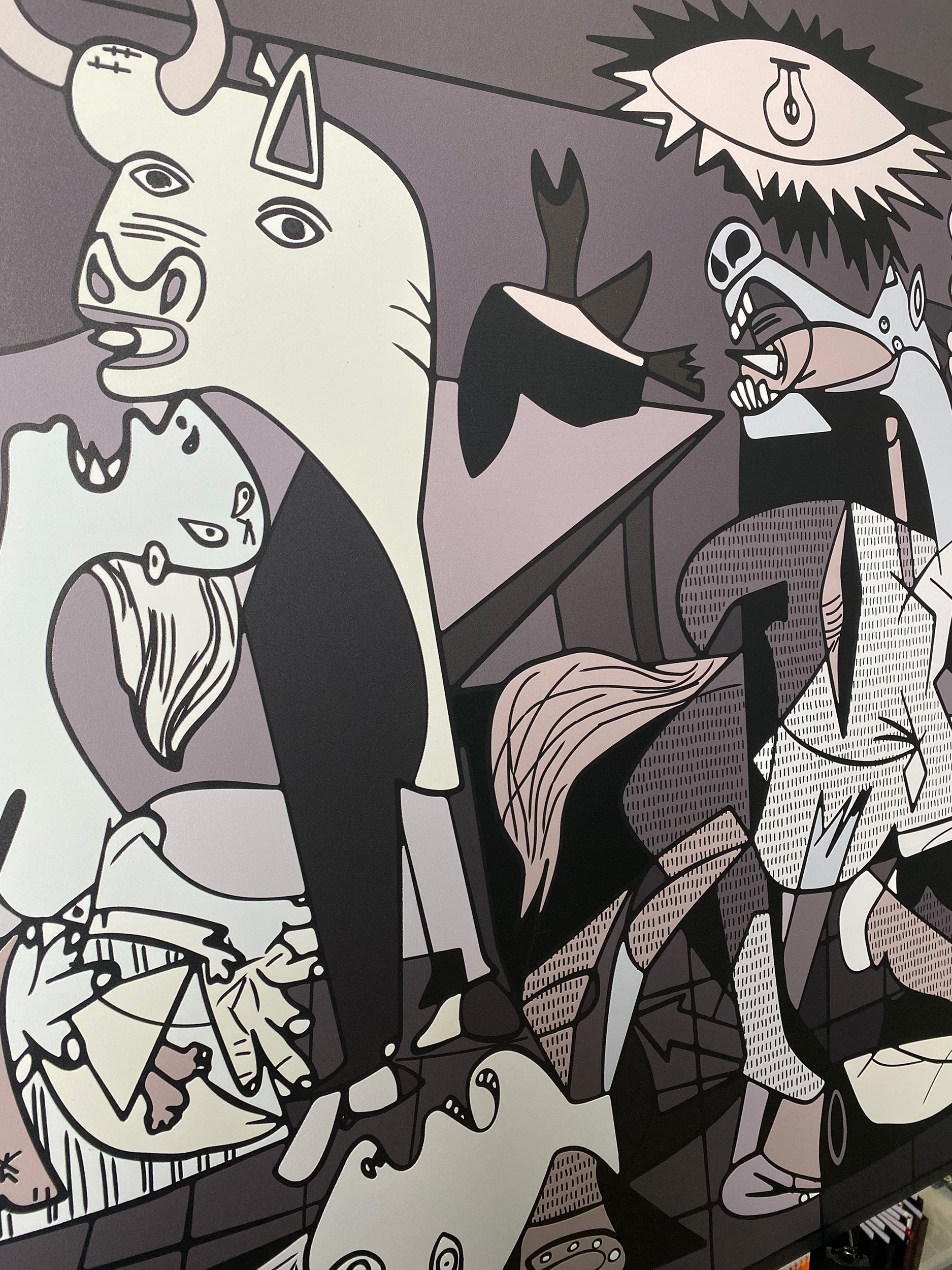 Quadro Materico del Guernica in colori pastello di Picasso. Realizzato con tecnica di stampa UV LED 2.5D in rilievo oppure con tecnica di stampa piatta HD. Effetto unico e realistico. Le immagini illustrano come viene l'effetto a zone in rilievo. Abbiamo riprodotto e modificato il Guernica originale in ogni suo minimo dettaglio. La stampa UV LED ci permette di avere colori vibranti e duraturi su un supporto rigido di alta qualità. Per ogni quadro vengono inclusi due ganci per poterlo appendere.