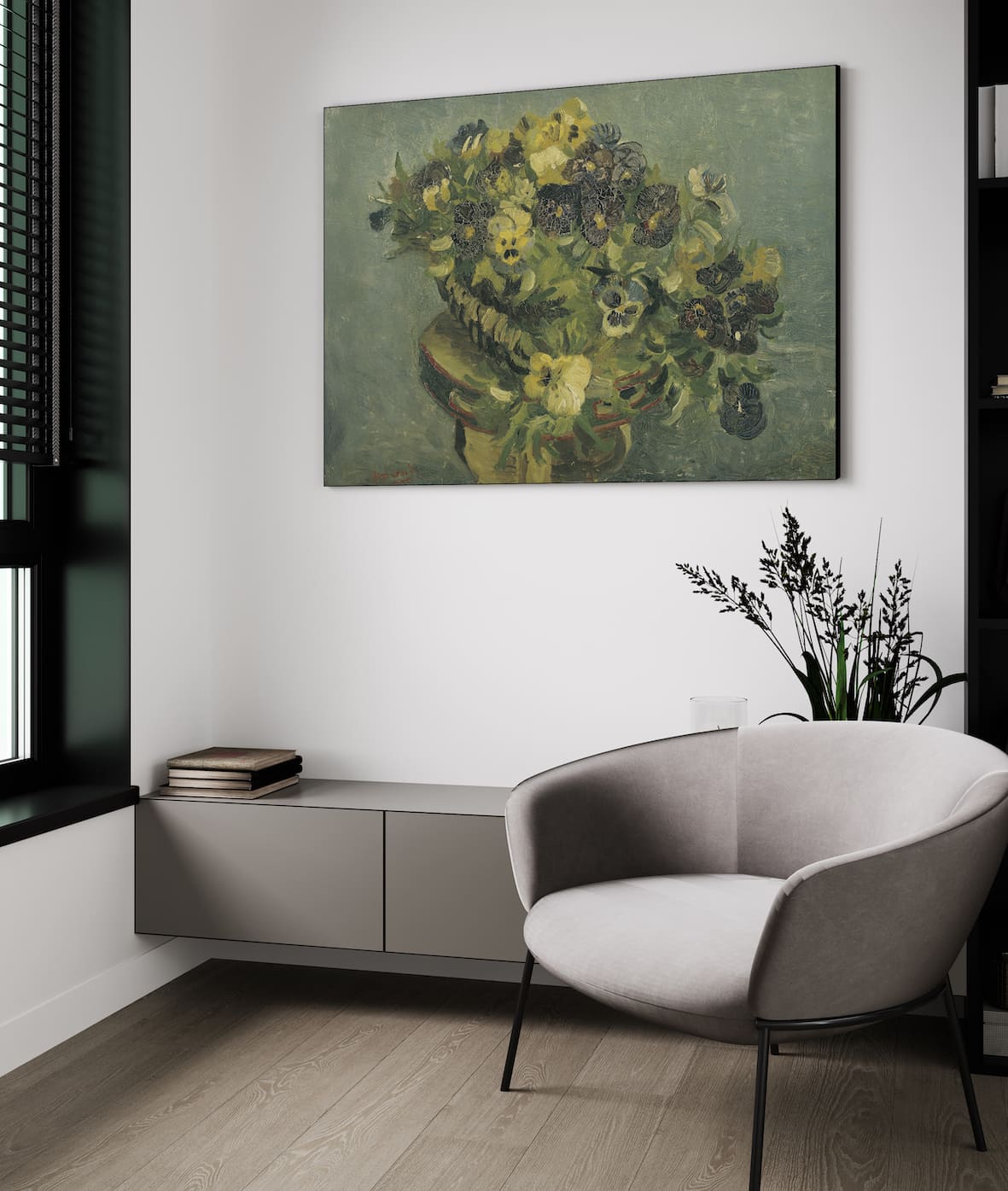 Van Gogh - Cestino di viole del pensiero su un piccolo tavolo | Stampa piatta HD o in 3D
