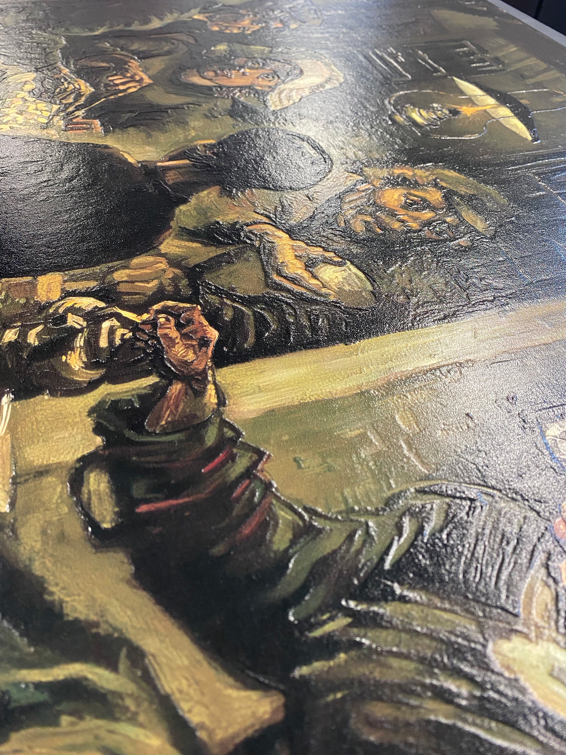 Il nostro quadro materico, ispirato al capolavoro di Van Gogh "I mangiatori di patate", è realizzato con tecnica di stampa piatta HD o con tecnologia 2.5D UV LED per ricreare la matericità del soggetto , offrendo un effetto 2.5D unico. La stampa UV LED ci permette di avere colori vibranti e duraturi su un supporto rigido di alta qualità. Sembra di avere un vero e proprio dipinto ad olio. Per ogni quadro vengono inclusi due ganci per poterlo appendere.